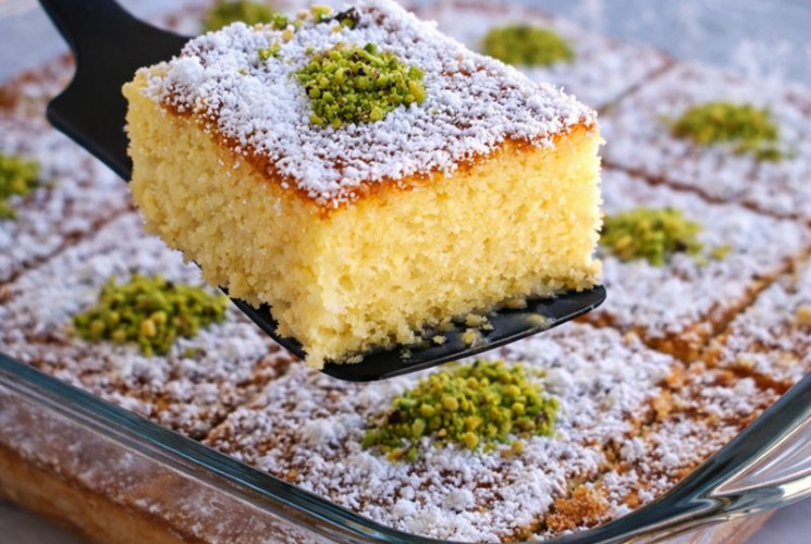 Malzemeler Tatlı için: 3 yemek kaşığı irmik 3 yemek kaşığı un 3 yemek kaşığı şeker 1 su bardağı yoğurt 1 su bardağı sıvı yağ 2 adet yumurta 1 paket kabartma tozu 1 paket vanilin Şerbeti için: 2 su bardağı şeker 2 su bardağı su Birkaç damla limon suyu Üzeri için: Pudra şekeri Toz Antep fıstığı (isteğe bağlı)